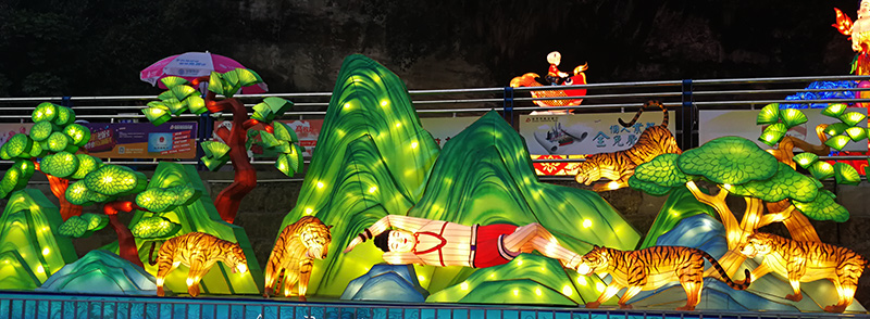 庙会彩灯制作案例——《舍身饲虎》彩灯灯组规格:长15米高5米,采用钢架结构,丝架造型,分色裱糊,内透光 ,美工喷涂彩绘的自贡彩灯制作工艺定制。