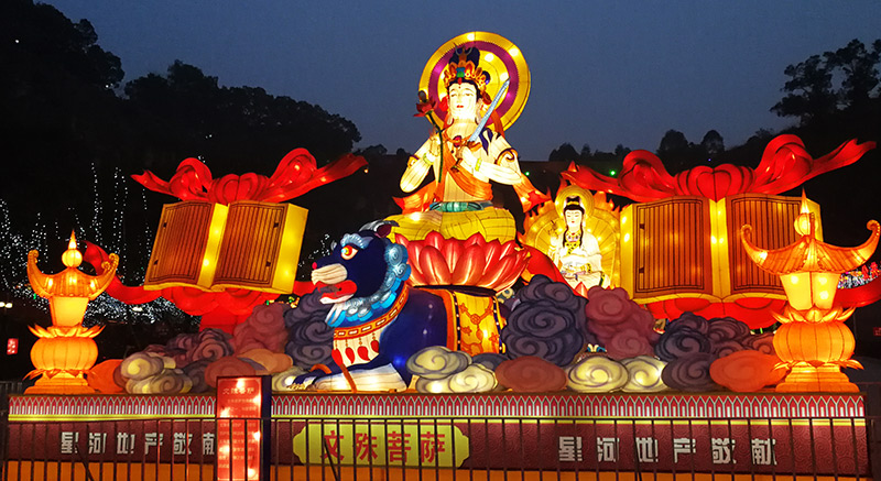 ?佛教彩灯制作案例——《文殊菩萨》彩灯灯组规格:长18米高6米,采用钢架结构,丝架造型,分色裱糊,内透光 ,美工喷涂彩绘的自贡彩灯制作工艺定制。
