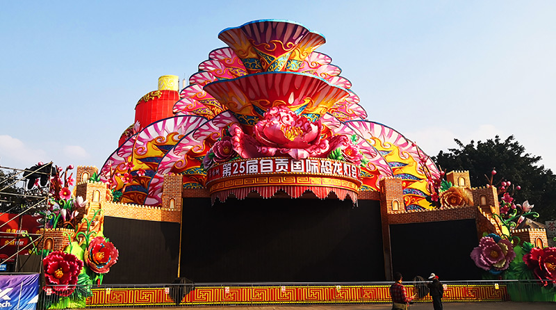 舞台彩灯制作案例——《欢乐中国》彩灯舞台背景采用全彩LED显示屏,部分背景扇形花纹采用半浮雕自贡彩灯制作工艺,牡丹花开合LED灯带勾勒轮廓,扇形背板局部七彩追光。