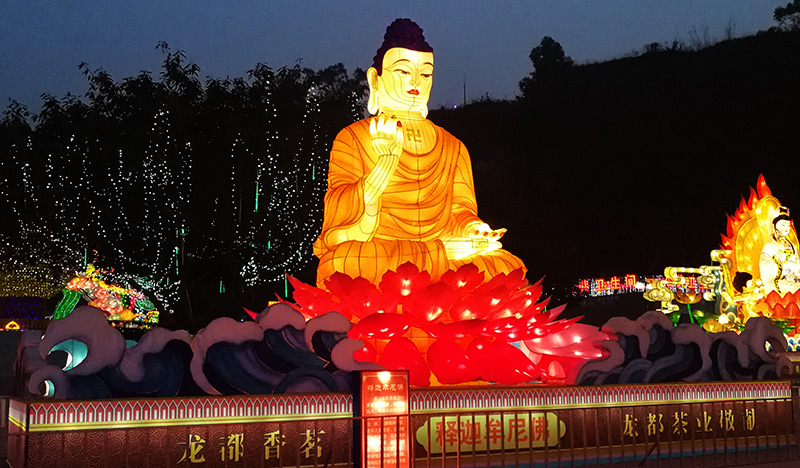 佛教花灯定制案例——《释迦牟尼佛》花灯灯组规格:长18米高6米,采用钢架结构,丝架造型,分色裱糊,内透光 ,美工喷涂彩绘的自贡花灯制作工艺定制。