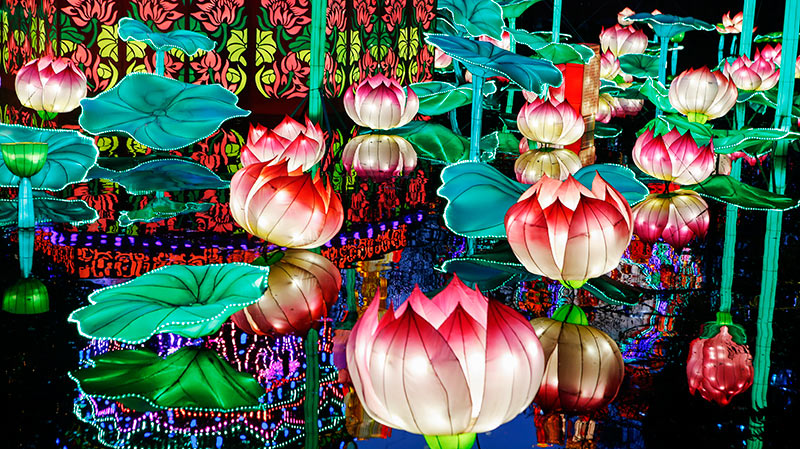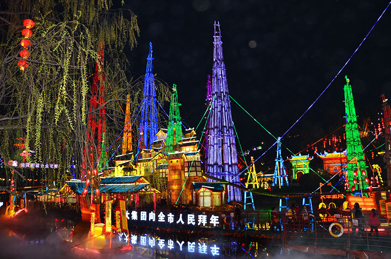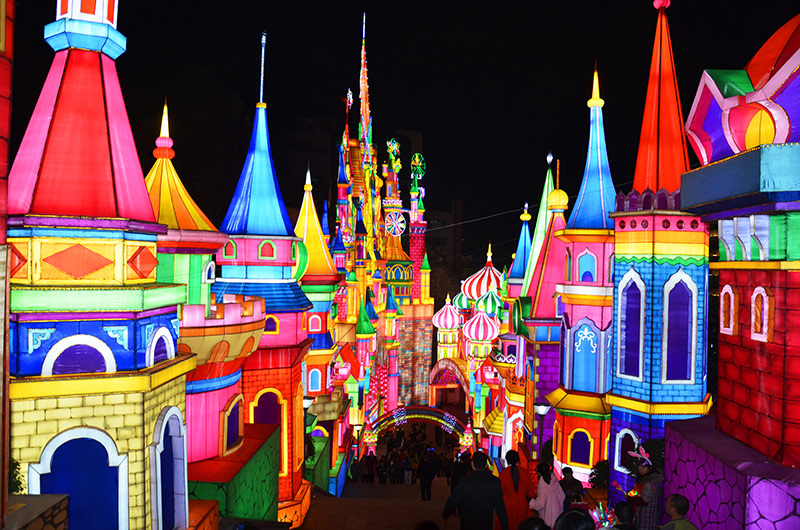 春节大型彩灯花灯制作案例——《 欢乐城堡》和《动漫街景》主要采用玻璃钢塑型、丝扎彩绘、特殊材质贴面等多种自贡彩灯工艺制作。