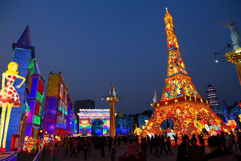 大型春节彩灯花灯制作案例——《埃菲尔铁塔》将法国文化元素和中国彩灯制作工艺融为一起,一方面采用欧美漫画表现风格,构思奇巧,设计大胆,制作精细,色彩丰富;另外一方面设计者又把中国传统彩灯文化元素融入其中,凸显铁塔造型上的活波夸张,色彩上的艳丽明快,营造出热情洋溢、风趣幽默的艺术效果。