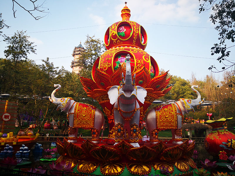 ?2019年大型水上自贡彩灯制作案例——《吉祥平安》灯组规格长60米,宽31米,高18米。主灯总高18米,底座2.5米高,葫芦高10.5米,采用自贡彩灯制作工艺纯手打造。