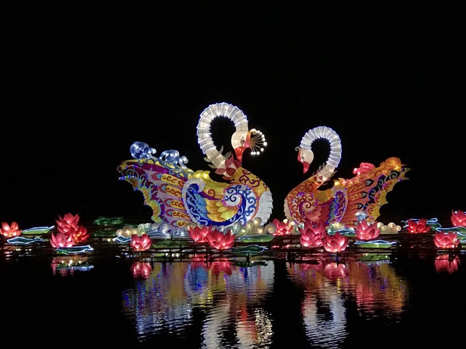 《中秋灯组》此花灯彩灯为中秋水上花灯彩灯,灯组美轮美奂,与水中倒影交相辉映。